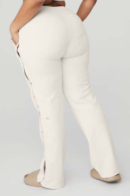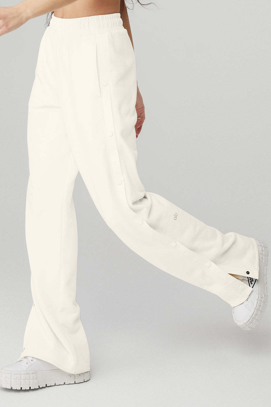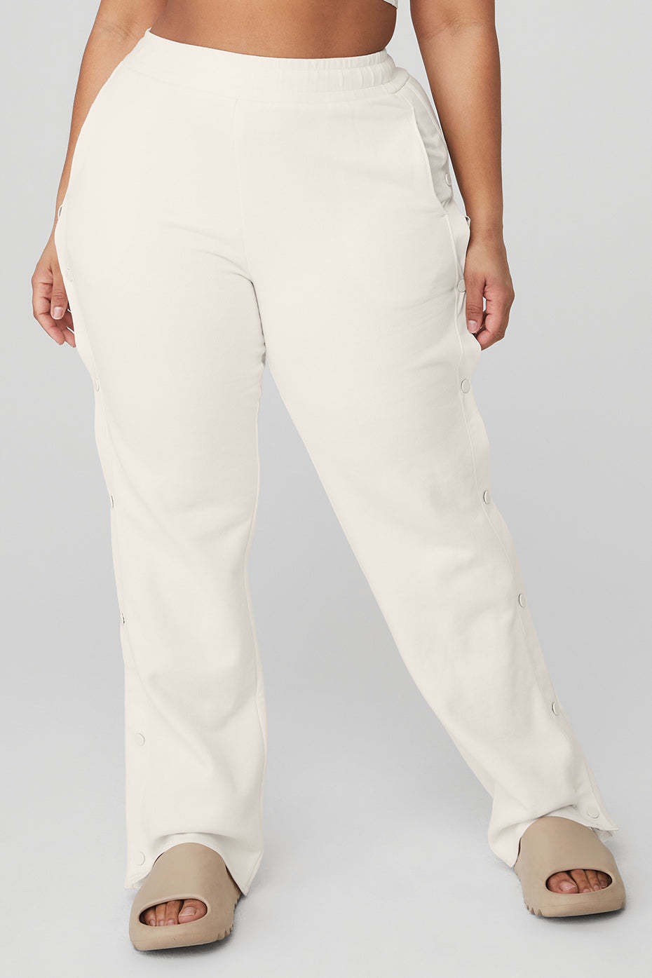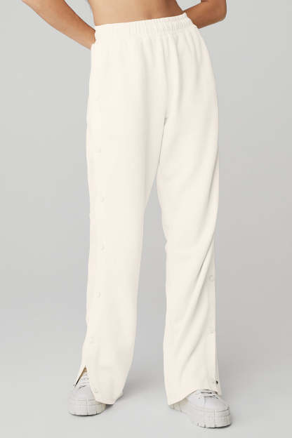 Serious track pant goals. The Courtside Tearaway Snap Pant is made with diagonal French terry and has a loose, straight-leg silhouette, side pockets, interior drawcords, and snaps down the sides. Wear it with a baby tee and sneakers.