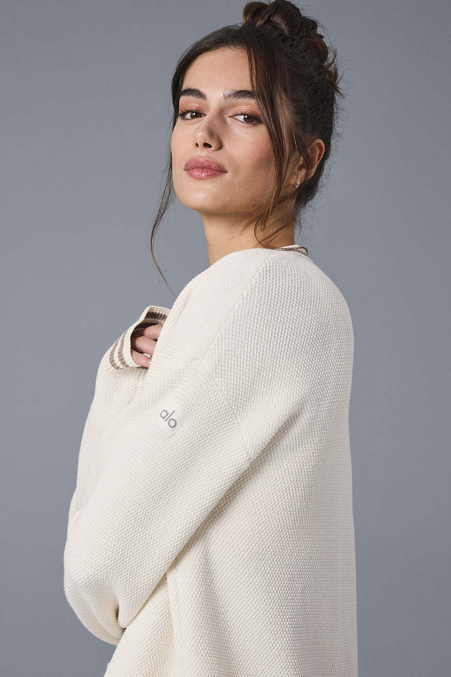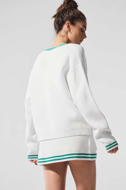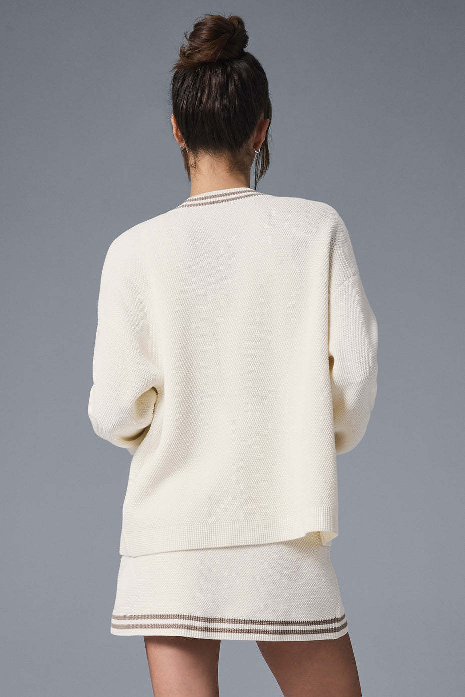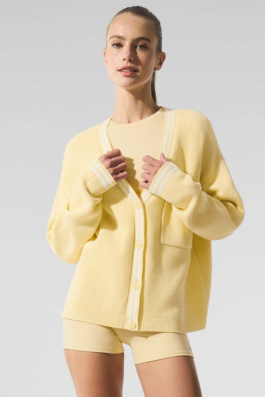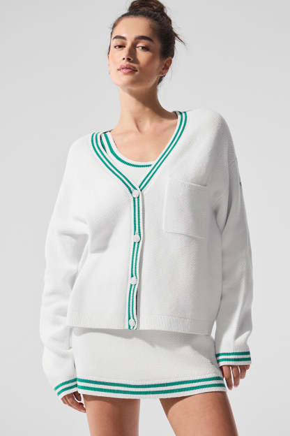 This is not your grandpa’s cardigan: Cut to fit the female form with a roomy drape, it has dropped shoulders, a four-button front, ribbed cuffs, and a hip-length hem. Striped trim gives it a classic yet cute look. And the best part? There's a whole Tennis Club capsule collection to style it with.