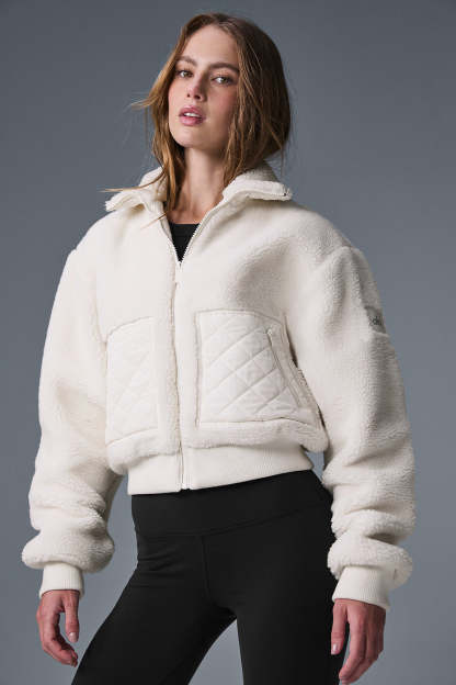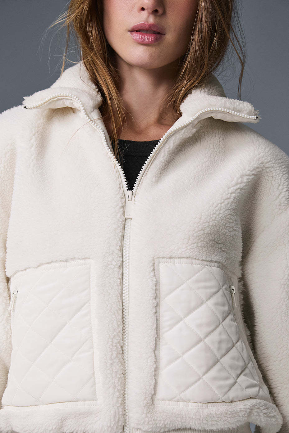 Done in sherpa with quilted patches at the pockets, elbows and back, this bomber jacket is, well, the bomb. We love the boxy, slightly cropped silhouette and the ribbing at the cuffs and hem— it makes the fit even cozier. Throw it on over a matching set en route to your workout, zip it all the way up, show off the sherpa-lined collar.